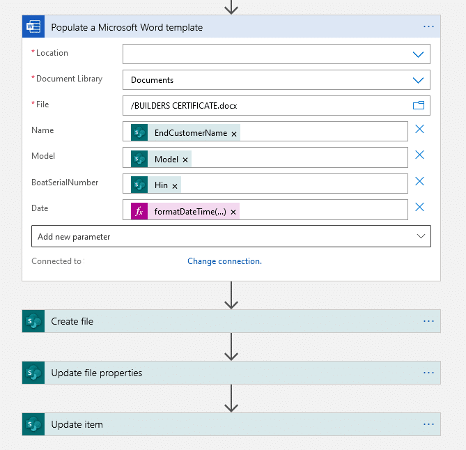 With document automation, the creation of different documents can be controlled with forms and workflows can be built for different types of follow-up actions. Word templates for Power Automate are easy to deploy. If your workflows are complex or have a lot of variation, then a SharePoint-based solution requires the use of several different Power Automate templates.