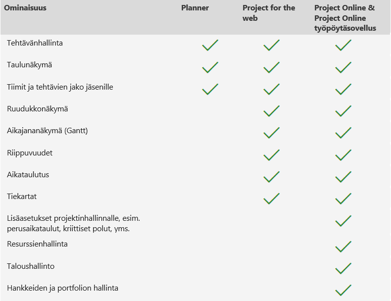 Alla yhteenvetoa Plannerin, Project for the web sekä Project Online -websovelluksen ja Project Online -työpöytäsovelluksen ominaisuuksista ja toiminnallisuuksista: