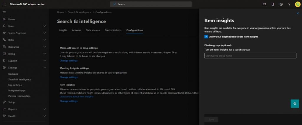 Administratörer har tillgång till Item Insights-kontrollen, objektinsikter på svenska, med vilken man kan inaktivera signaler för alla användare eller vissa användargrupper i Azure AD.