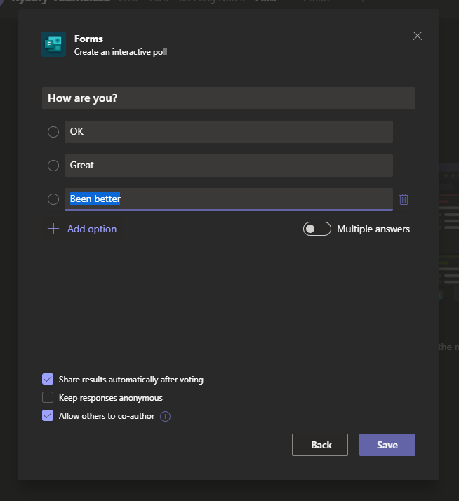 - Tillåta samredigering av omröstningen dvs. att alla deltagare kan redigera undersökningen, eller att endast mötesarrangör och medpresentatörer kan redigera undersökningen