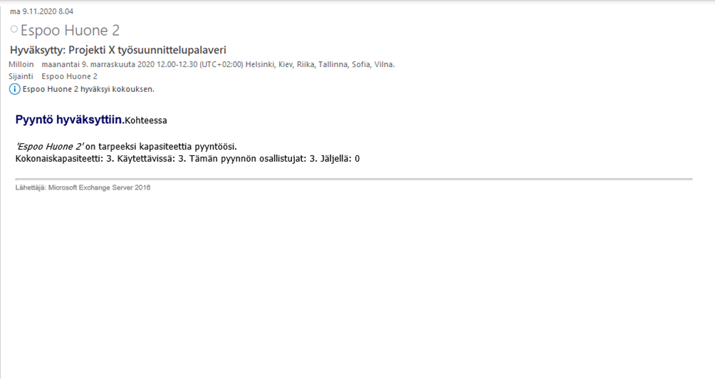Lähetettyään kokouskutsun sekä työpisteelle että osallistujille, varauksen tekijä saa automaattisen hyväksymis- tai hylkäysilmoituksen työpisteen varauspyynnölleen. Riippuen kokouksen osallistujamäärästä, ilmoitus varmistaa, mikäli tarvittava määrä työpisteitä on varattavissa, ja kuinka monta työpistettä on jäljellä varattavana.
